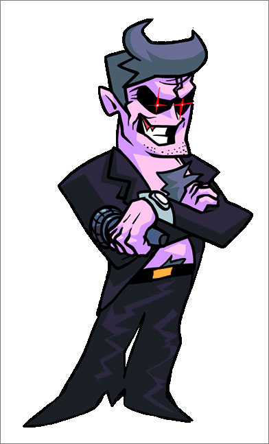 Daddy Dearest有着恶魔般的外表,紫色的皮肤,黑色的眼白,发着红光的瞳孔,灰紫色的头发隐隐约约像恶魔的角。他穿着一件敞开的黑色西装外套,没有穿衬衫,露出灰色的胸毛和yin毛(请好好穿衣服好吗),黑色的裤子由一条带着金色扣子的腰带系着,左手腕上戴着一块银色的手表。他的下巴上有一些胡茬,额头上有一个印记。他的左手拿着一个麦克风