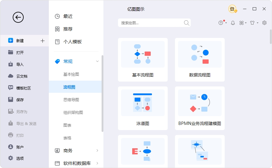 1、在“新建”页面中,你可以看到“流程图”分类。双击其中的小类如“基本流程图”,就可以创建相应的空白画布。