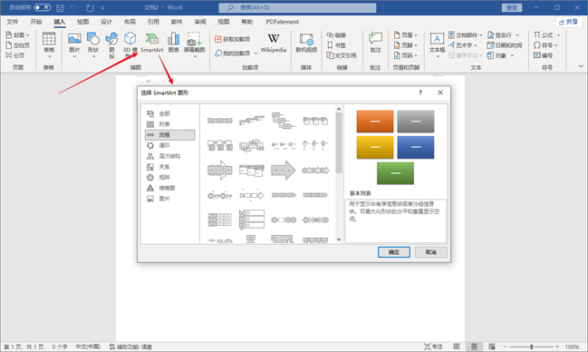 1、打开Microsoft Word,在“插入”菜单中,你可以看到 SmartArt。点击SmartArt,在它弹出的选项卡中点击“流程”部分,选择你想要的布局,然后根据自己的需求调整相应的图形参数。