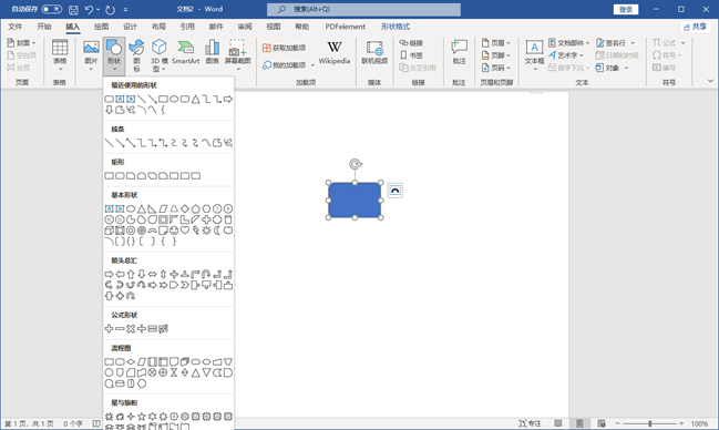 2、如果你想要的流程图布局不在 SmartArt 选项卡中,就只能选择一个一个地添加形状。单击“形状”选项并选择某个特定形状,Word画布上将出现一个“+”光标,你可以拖动它来创建自己所需大小的形状,也可以单击形状以创建标准大小的形状。