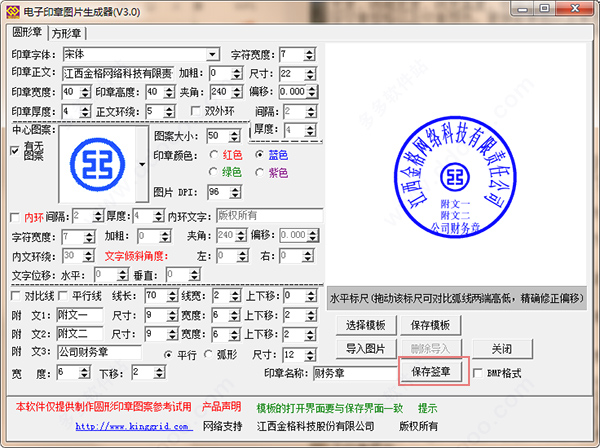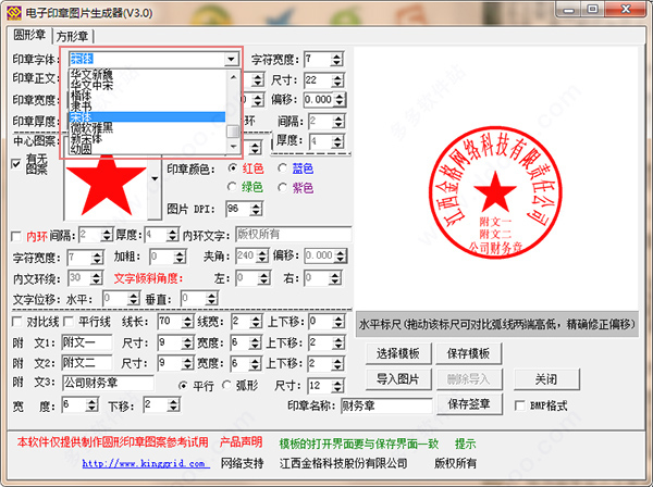 3、作为非专业人士来说,使用印章生成器就是最便捷的制作印章方法,通过软件可以随心所欲设计出自己满意的印章,用户使用电子印章图片生成器这款软件可以生成圆形章和方形章,还可选择印章规格以及印章颜色,这里的每一种印章模板都可以根据你的需求来设置版式,你可以任意改动画笔宽度、线框宽度、线宽高度、切角长度以及线框的左右平移。