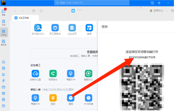 3、弹出【该应用仅支持移动端打开】,用手机扫描二维码后即可考勤打卡。