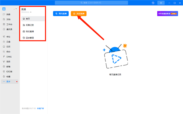 2、进入【直播】栏目,选择【发起直播】选项,