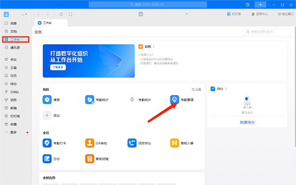 1、进入【工作台】任务栏,选择【考勤管理】选项,