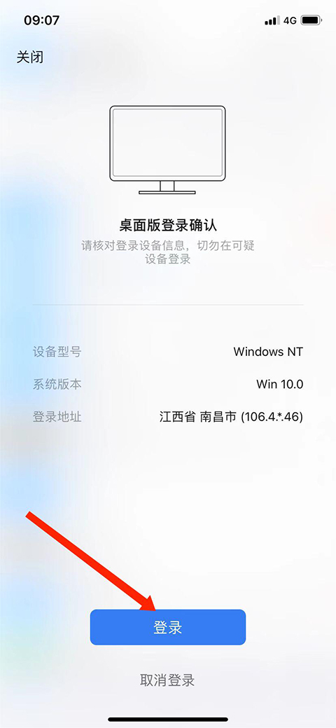 2、出现二维码,我们用手机进行扫码登录,在手机上选择【登录】选项,