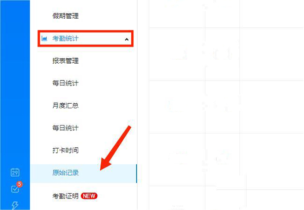 2、进入【考勤管理后台】界面,在考勤统计栏目下选择【原始记录】选项,