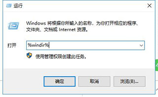 2、然后再次使用鼠标左键单击打开计算机桌面左下角的“开始”菜单,并输入“运行”两个汉字,单击打开搜索到的“运行”程序(或直接使用Win+R快捷键来打开)。在“运行”窗口的输入栏中输入“%windir%”并点击“确定”。