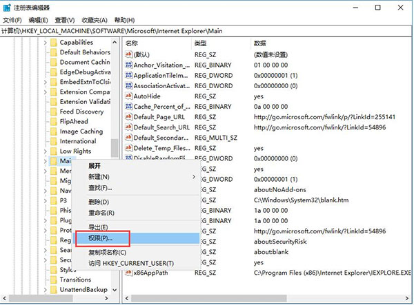6、然后在打开的“注册表编辑器”窗口中找到HKEY_LOCAL_MACHINE→SOFWARE→Microsoft→Internet Explorer文件夹下的MAIN子文件夹,并直接用鼠标右键单击该文件夹。之后在打开的右键菜单中单击选择“权限”一栏。