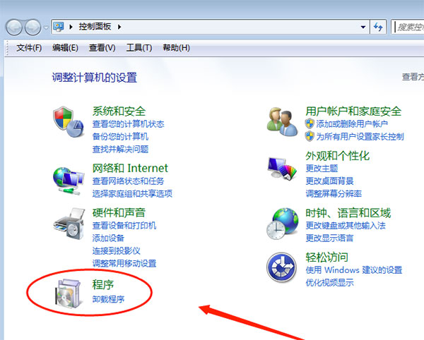 2、在控制面板窗口中,找到“程序”菜单,使用鼠标左键单击下方的“卸载程序”功能 。以win7操作系统为例,如果是其他windows操作系统可能会有差异。