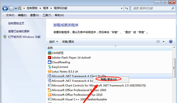 3、之后在卸载或更改程序列表总,找到需要卸载的.net framwork 4.0,选中该项,然后使用鼠标右键单击,并在右键菜单中选择“卸载、更改”选项。