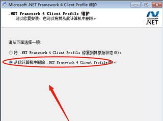 4、之后会打开.net framwork 4.0的卸载窗口,我们需要选择的是“从此计算机中删除.NET Framwork 4 Client Profile”选项,然后点击下方的“继续”按钮。