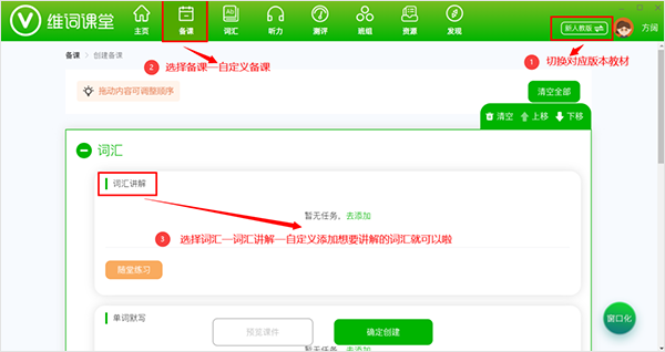 老师可以自定义编辑想要讲解的单词。词汇讲解的内容会结合例句让学生理解单词释义;多个释义的词汇对高频释义和低频释义进行标注;每个单词都有相应的测试题,方便学生巩固。