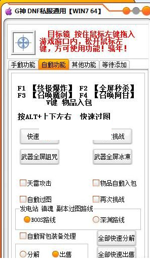 G神DNF私服辅助Win7是一款专为地下城与勇士(DNF)私服玩家设计的游戏辅助工具,兼容Windows 7系统。该辅助提供多种实用功能,如自动连招、一键拾取、无敌模式、技能无CD等,帮助玩家轻松刷图、提升效率。其简洁的界面和稳定的性能广受好评,操作简单,适合新手与老玩家使用。