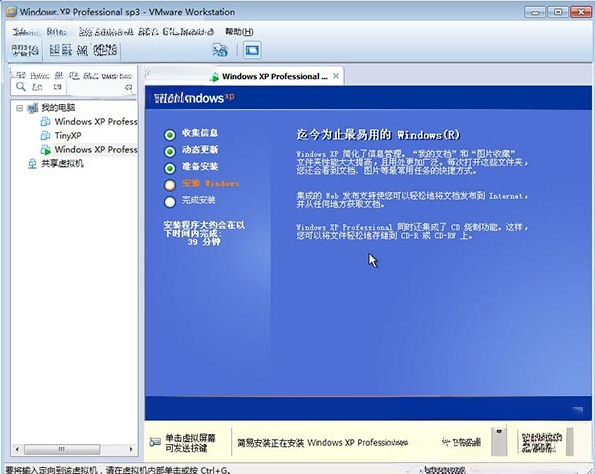 10、成功安装后,winxp系统将自动重启,这里开始真正的安装,包括收集信息,动态更新等等,预计39分钟完成安装;