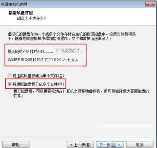 6、设置虚拟机硬盘大小,建议按默认的40G大小即可,另外选择“将虚拟磁盘拆分成多个文件”;