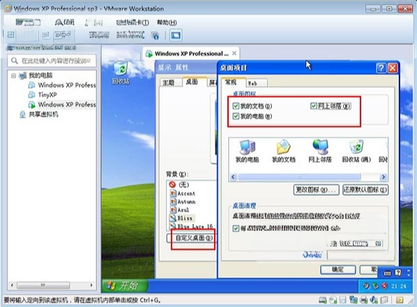 13、好了,成功进入winxp桌面,目前桌面上只有回收站,右击桌面属性–自定义桌面–勾选我的文档、网上领居、我的电脑,确定即可;