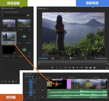-要在源监视器中打开某个剪辑,请在时间轴面板中双击该剪辑。在将剪辑添加到序列之前,可以使用源监视器查看剪辑、设置编辑点及标记帧。通过操作时间轴面板中的剪辑来优化序列。