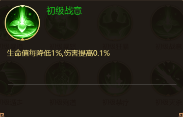 战法-战意(初/中/高/特级战意,生命值每降低1%,伤害提高0.1%/0.2%/0.3%/0.4%)