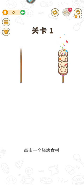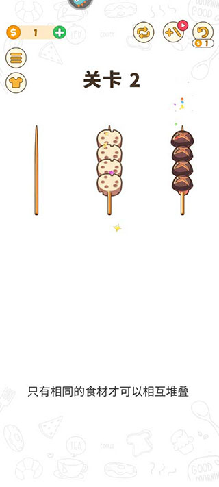 1、游戏的开始就是简单的两个竹签,通过点击其中一个竹签将食材转移到另外一个竹签上面,当竹签上的食材全部相同之后即可通关。