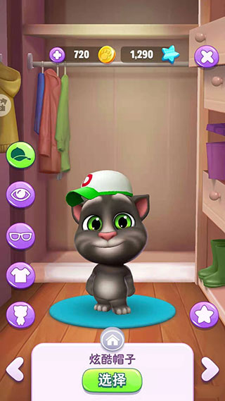 1、首先我们进入卧室,点击左边的衣柜,进入这个衣帽间后,左边有一列分类,分别是帽子、眼睛、眼镜、衣服和小猫的皮毛,总共有五项分类进行打扮。