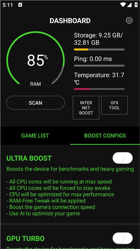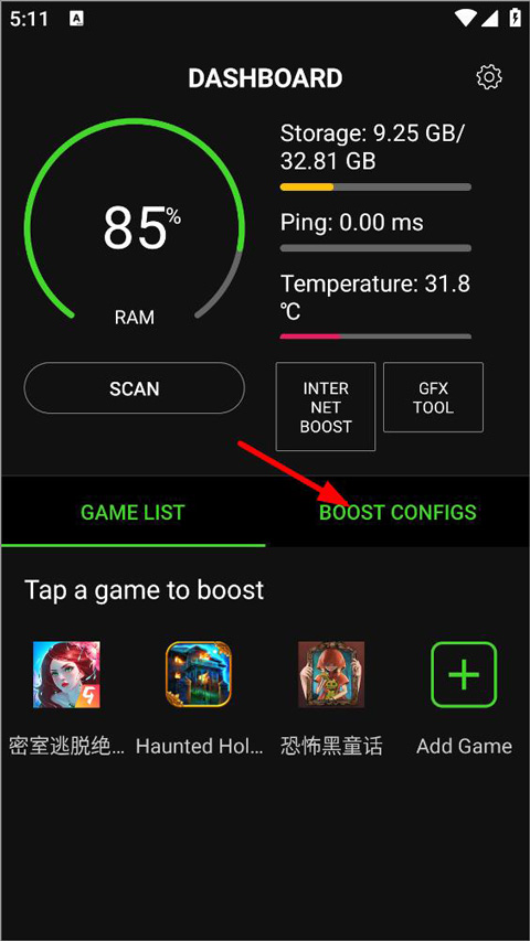 1、用户打开增压+app,进入主页面,该页面用户可查看手机电量、内存、温度等,点击GAME LIST中的“+”;
