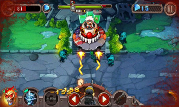 1、打开暴击僵尸游戏后,第一关的BOSS是坐在飞碟上的僵尸制造者,好像是一个坐着飞船的外星人。关卡是美国7-6。