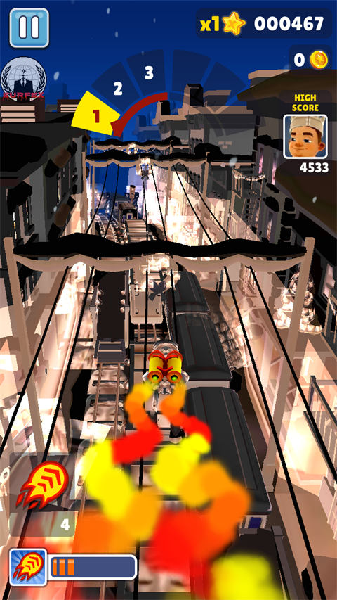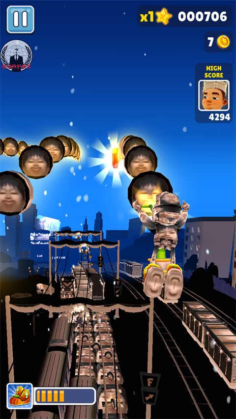 地铁跑酷郭继凯之城版是为地铁跑酷热门博主锅铲而定制的,当我们进入游戏之后就会发现,游戏内充斥着锅铲元素,无论是游戏加载页面还是游戏内的地铁、金币、还是场景等,都铺满了锅铲恶搞头像,意境十足,同时再配以奇特的背景音乐,让我们在跑酷的途中感受到轻松愉快的感觉。