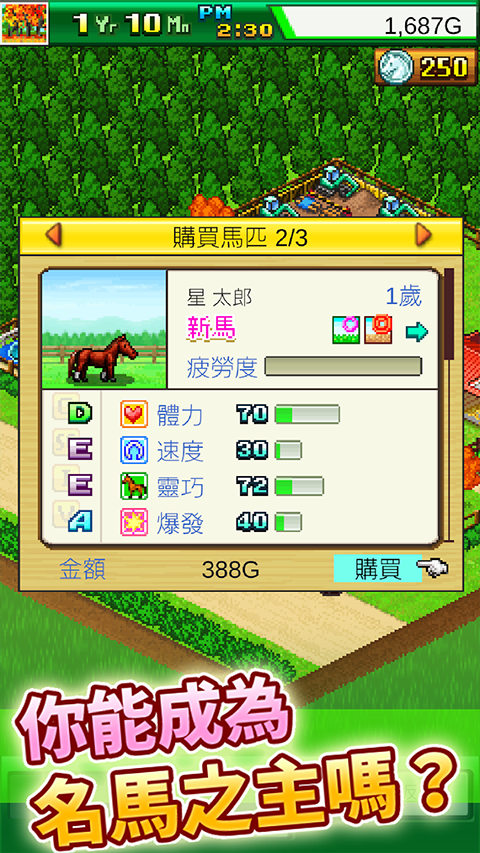 赛马牧场物语是一款精致的像素风经营模拟手游。玩家将化身牧场主,从零开始打造专属马场,培育良驹、参加赛事、吸引游客,体验悠闲又充满挑战的牧场经营乐趣。游戏操作简单易上手,画面复古温馨。你可以悉心照顾每匹赛马,调配饲料、安排训练、治疗伤病,甚至通过配种培养属性更强的下一代。参与国内外各级比赛,赢得奖金和荣誉,还能扩建设施、雇佣员工、提升牧场知名度,逐步成为世界闻名的赛马胜地。