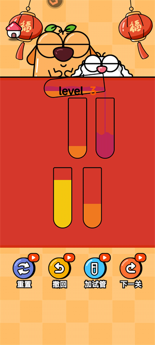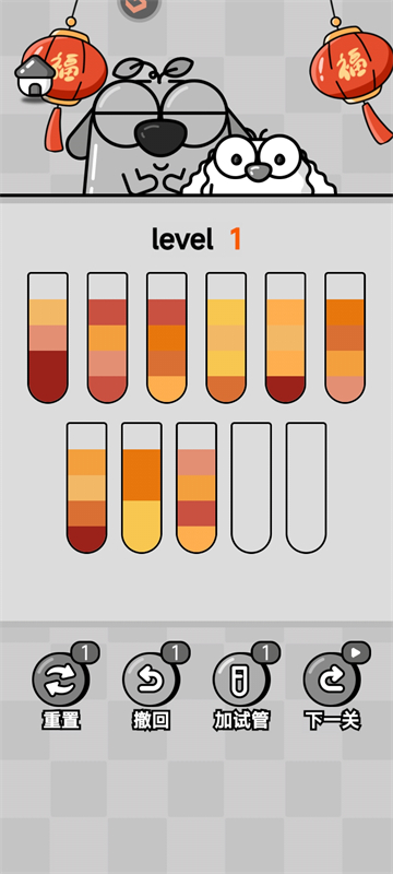 2、进入游戏后,我们需要把所有试管里的彩色液体,按颜色分层归类,让每个试管最终只装一种颜色就能成功通关