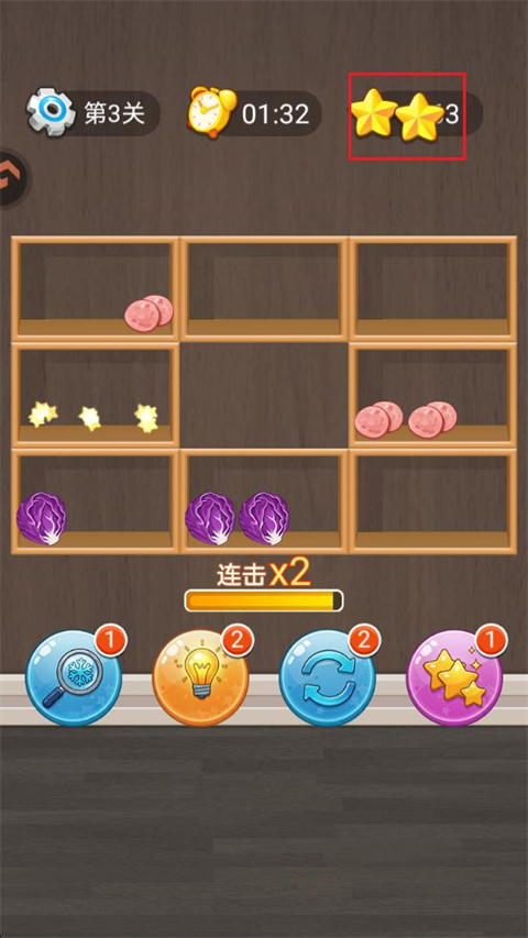 1、进入游戏后,需要在有限的收纳格中,将三种相同的食材连成一组进行消除。