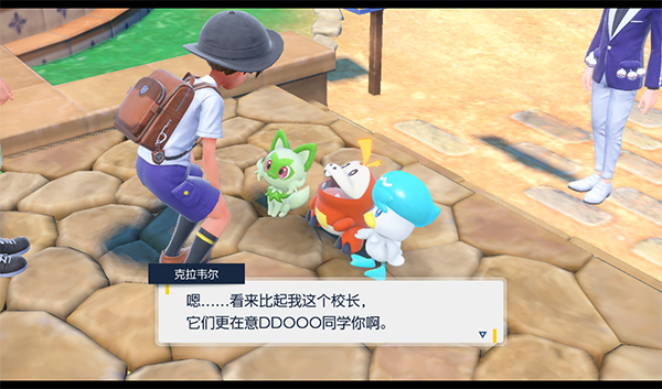 宝可梦朱初始角色戴着蓝色帽子,身着橘色的短裤,宝可梦紫则戴着灰帽子,穿着蓝紫色的短裤。