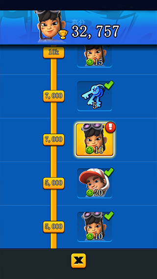 7、跑酷分数越高就能获得更多的升级奖励,每个角色都有着技能系统。比如杰克一阶段技能位获得一个磁铁,二阶段捨取金币就能为滑板充能,三阶段开始游戏就可以获得一块滑板。