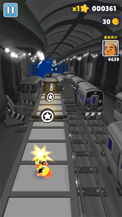 有地铁也会有山洞,中间有一根柱子,左右两边无规律会有火车奔过来,这个时候就要考验玩家的应变能力。 在前期的时候过个山洞表示毫无压力,后期30w过后经常有玩家出现手指反应不及时然后被撞死的现象。对于过山洞的技巧,眼疾手快是前提,关键是心态要放平静 这样才不会手滑。