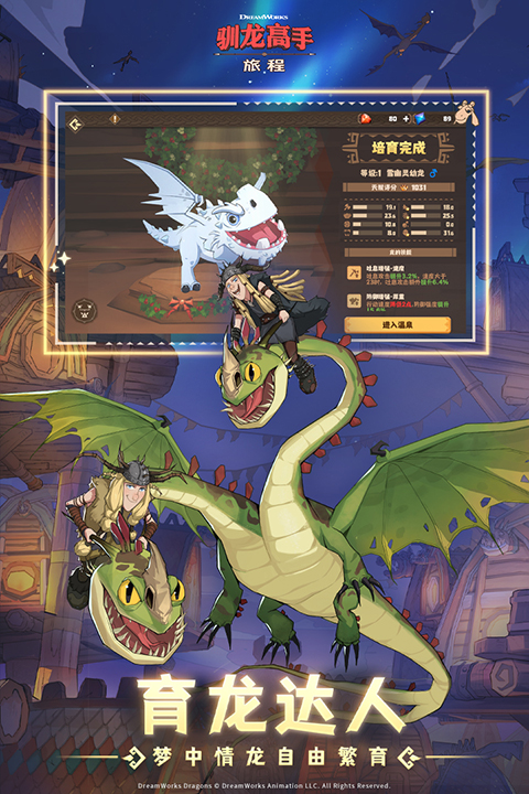 驯龙高手旅程是一款由梦工厂正版授权,基于经典动画电影《驯龙高手》世界观打造的3D模拟养成手游。游戏完美还原了博克岛的北欧风情和众多经典角色与龙族形象,玩家将化身一名年轻的驯龙骑士,与没牙仔等熟悉的飞龙们建立羁绊,共同探索广阔的天空,体验养育、训练飞龙和建设家园的乐趣。驯龙高手旅程不仅完美再现了电影中人与龙之间深厚的情感纽带,更通过丰富的游戏玩法让玩家能够亲身参与到这个充满幻想与温情的世界中。无论是驯龙高手的粉丝,还是喜爱模拟养成与冒险的玩家,都能在这段旅程中找到属于自己的驯龙梦想。