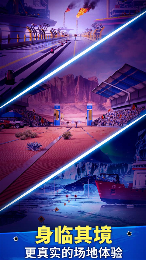 采用顶级3D引擎打造,场景涵盖都市街区、沙漠戈壁、雪山之巅等多种地形。逼真的环境细节和光影效果,为玩家营造出身临其境的作战氛围。