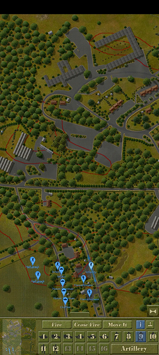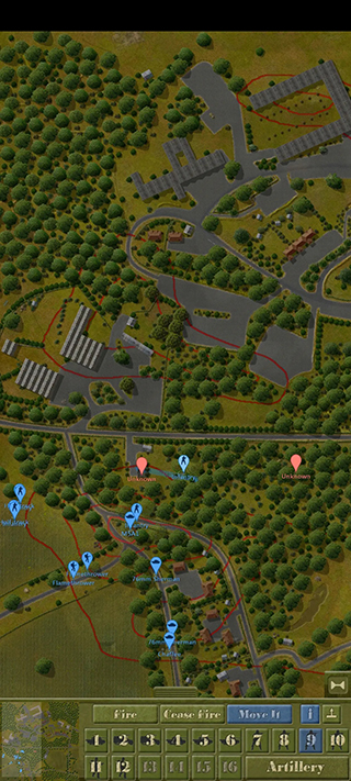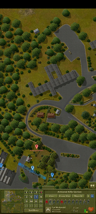 4、由图可见,这种情况非常危险。我方的余回部队被发现,但由于处于丛林复杂环境没有被交叉火力压制,我决定让他强行进攻,并派遣m5a1进行支援,地图最左端的机械步兵则进行大于回穿插,机械步兵团的位置被遮蔽物环绕,不用担心遭到火力打击,