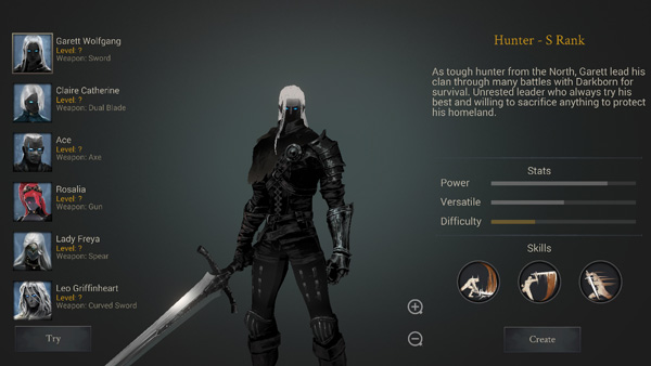 1、打开恶魔猎手暗影世界官方版,点击屏幕开始,选择一个喜欢的角色;