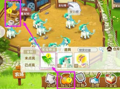 13、1牧场商店2饲养市场3仓库(动物产品、未放羊幼崽在这里)4装饰市场5图鉴收藏6活动7寻宝