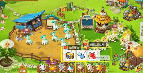 11、点击工具箱,则出来工具。在这里,点击相机,可以对农场拍照留念,点击哨子,则可以设置队形,点击爱心则可以捐赠未成熟动物。