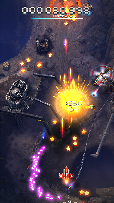 战机升级: 通过收集关卡中的星星(积分),可以永久升级你的战机,包括主武器、副武器、超级炸弹和防护罩。这是游戏最核心的养成线。