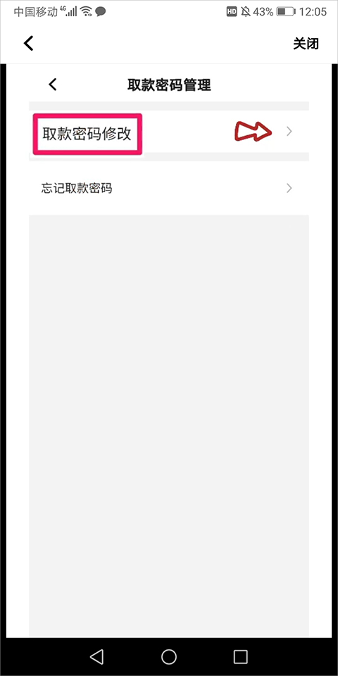 3、接着在打开的取款密码管理页面中点击【取款密码修改】右侧的箭头图标