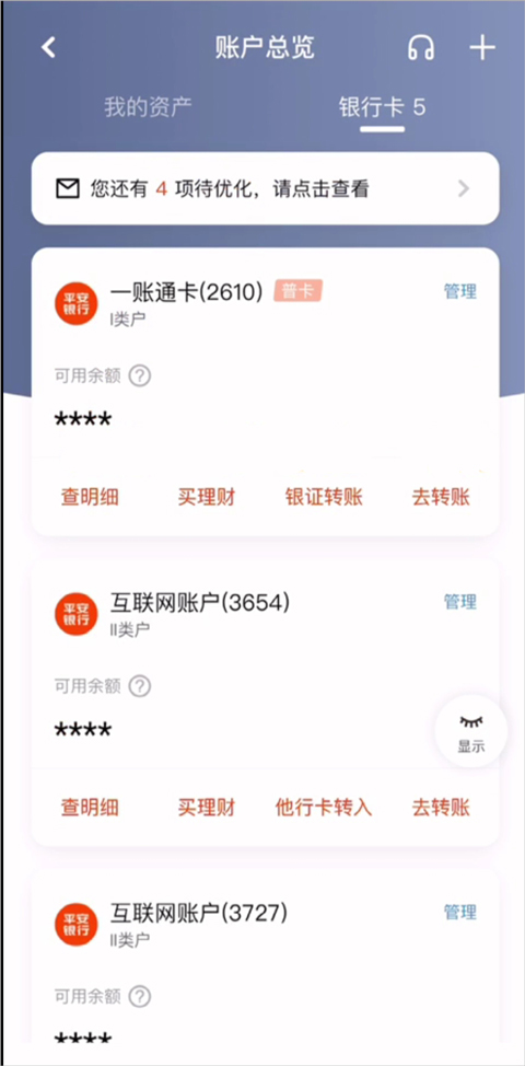 直观展示您名下所有账户(储蓄卡、信用卡等)的资产与负债情况,余额、收支流水一目了然。