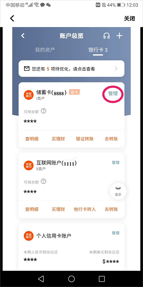 1、进入平安银行app【我的】页面中点击【账户】,在打开的新页面中选择要修改密码的卡片后点击其右侧的【管理】