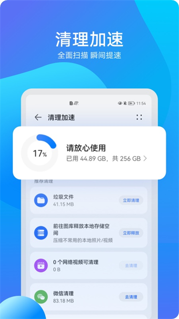 智能扫描并清理设备中的缓存垃圾、冗余文件、卸载残留及重复文件,释放存储空间。同时,一键结束后台非必要运行程序,快速释放内存,让手机运行恢复流畅。