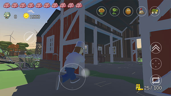 2、左上角的“大脑”是生命值,底部是目前已击杀的僵尸数量和阳光数,滑动右侧屏幕可以旋转视角,还有跳跃、瞄准以及换弹等快捷按钮。