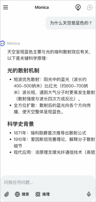 1、智能对话与问答:您可以像与一位博学的朋友聊天一样,向Monica提出任何问题,从学术研究到生活技巧,它都能提供详尽、准确的回答。
