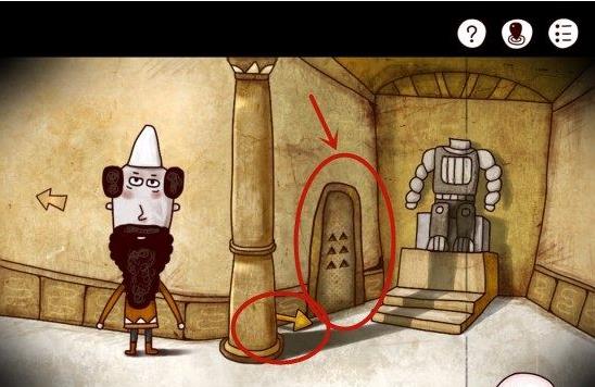 6、神庙大门的密码也没变,记不得的小伙伴可以前往灯塔2楼问船员。进入神庙后,去2楼。进入2楼后,2楼左边的墙上多了一扇门,门上有三角形凹槽。和刚刚捡的三角石块相符。可以先不管。先把地上的箭头捡了。