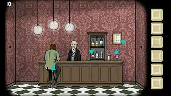 9、接着根据提示再调一杯酒「1×VODKA、1×TABASCO、2×BLOOD(血)」,递给男人后开枪自杀,点击枪洞,先走左边,沿途收集到3个「方块」,从左边出来后再次进去,这次走右边收集到1个「方块」,在右边有一个密码箱,暂时不用管。