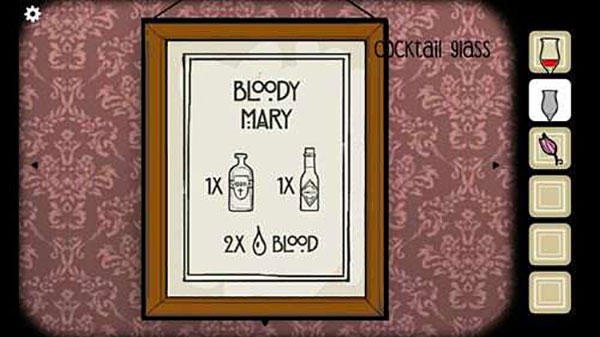 8、完成拼图,获得提示,根据提示打开柜子左边的暗格获得提示「2×JUICE、1×GALLIA、1×VODKA」,根据提示再调一杯酒递给男人,多次点击男人,额头流血后使用酒杯获得「血」。