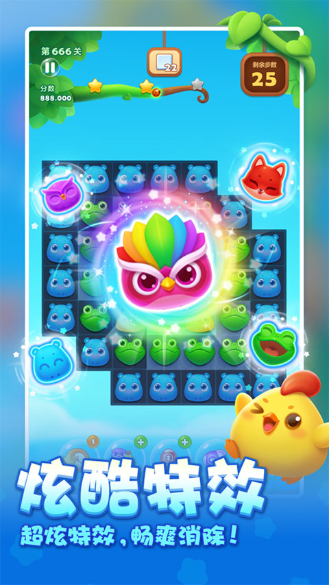消除四个或以上小动物,或组成特殊形状,就能生成威力强大的特效动物,如直线特效、爆炸特效、魔力鸟等。将两个特效组合,更能引发毁天灭地的全屏清场效果,视觉冲击力极强,爽感十足!